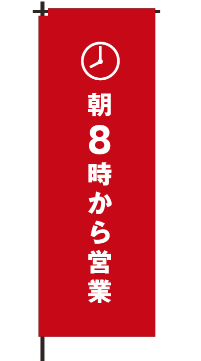 「 朝8時から営業 」ベース色:赤形状:袋縫い