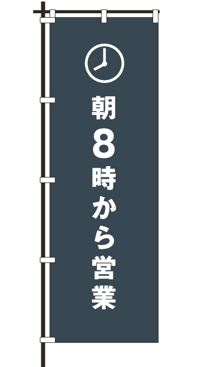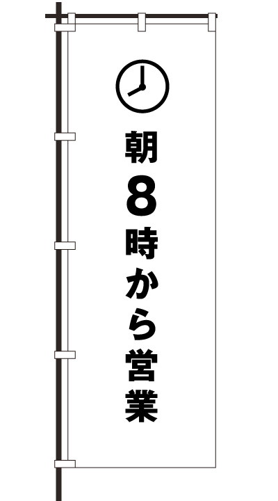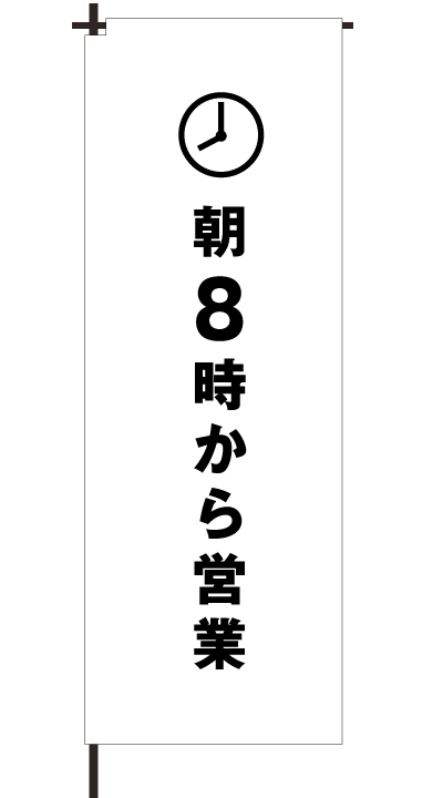 「 朝8時から営業 」ベース色:白文字色:黒形状:袋縫い