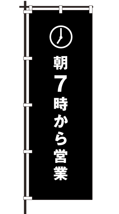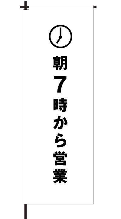 「 朝7時から営業 」ベース色:白文字色:黒形状:袋縫い