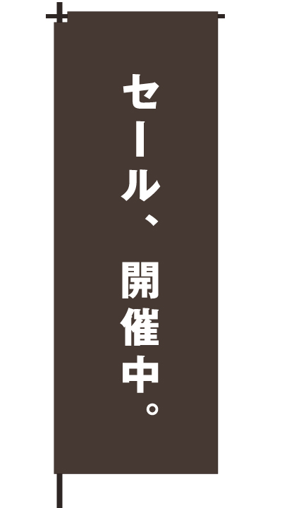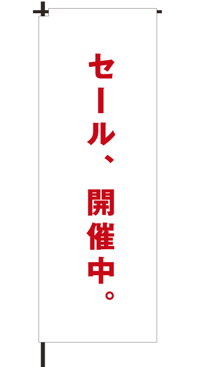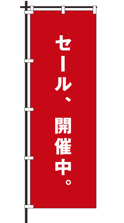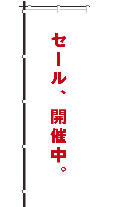 「 セール、開催中。 」ベース色:白文字色:赤形状:袋縫い